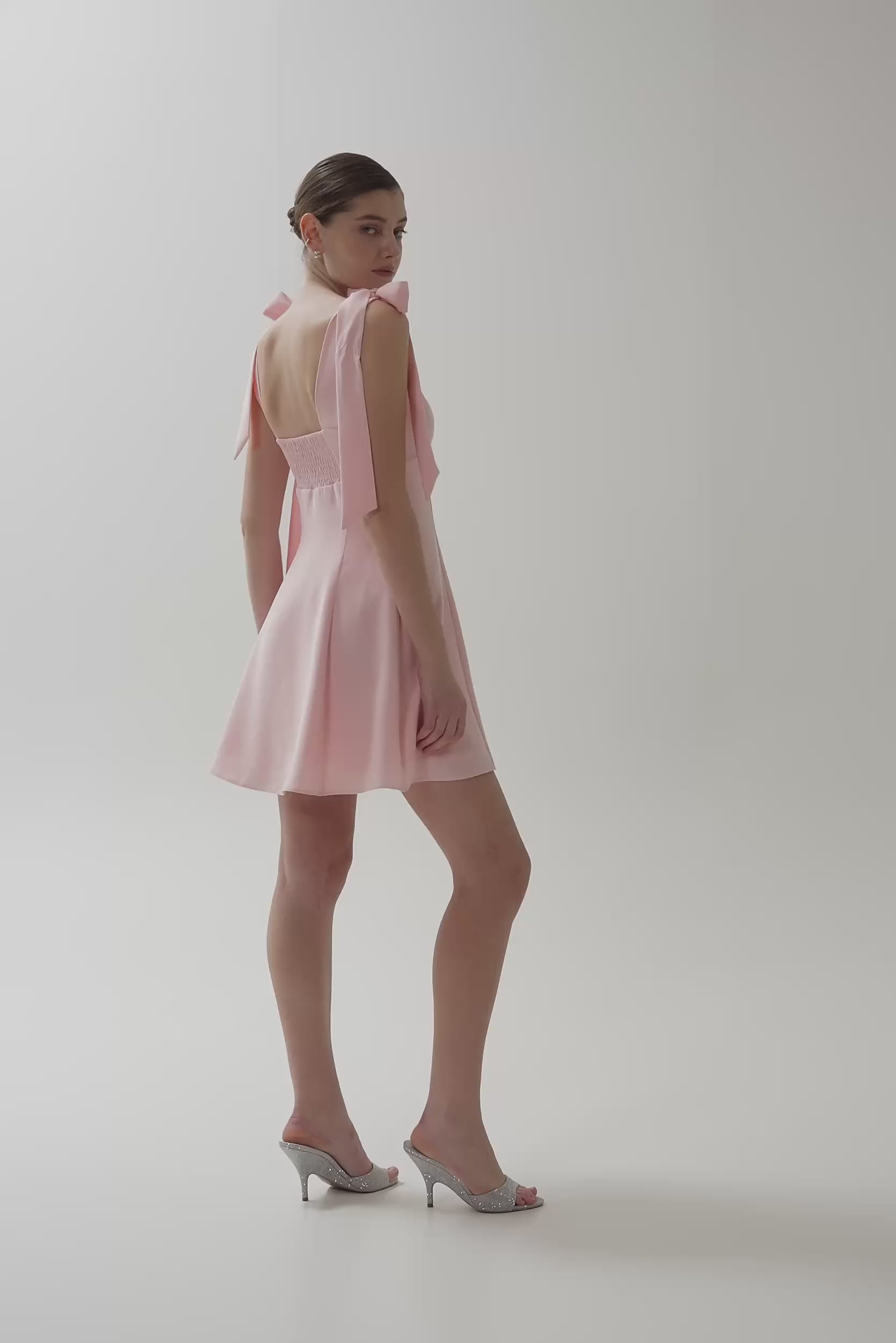 Ribbon-strap flared mini dress in pink crepe Sale price€395,00