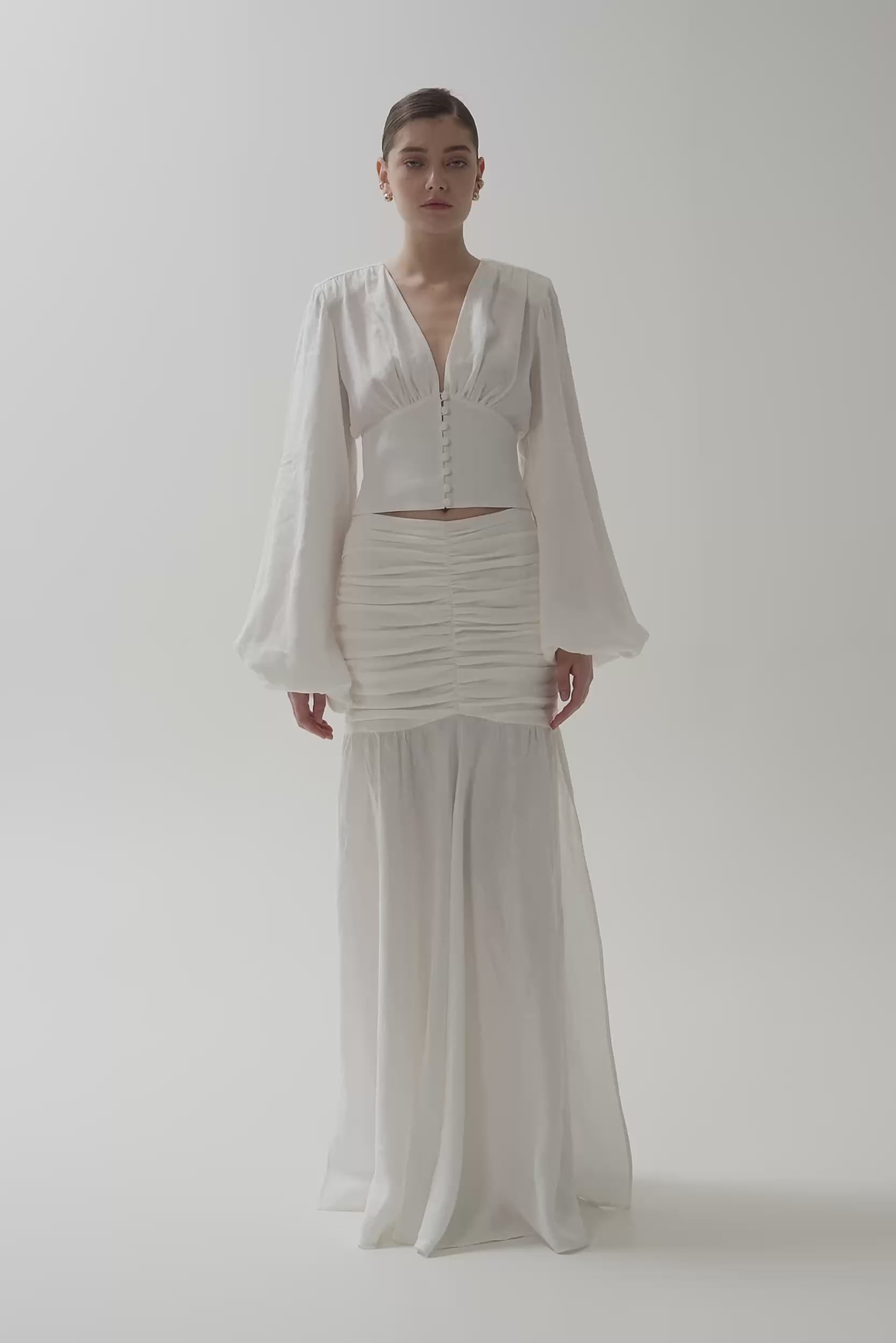 Ruched maxi skirt in white linen